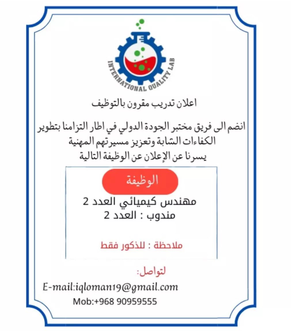 مختبر الجودة الدولي - اعلان تدريب مقرون بالتوظيف ( مهندس كيميائي + مندوب )