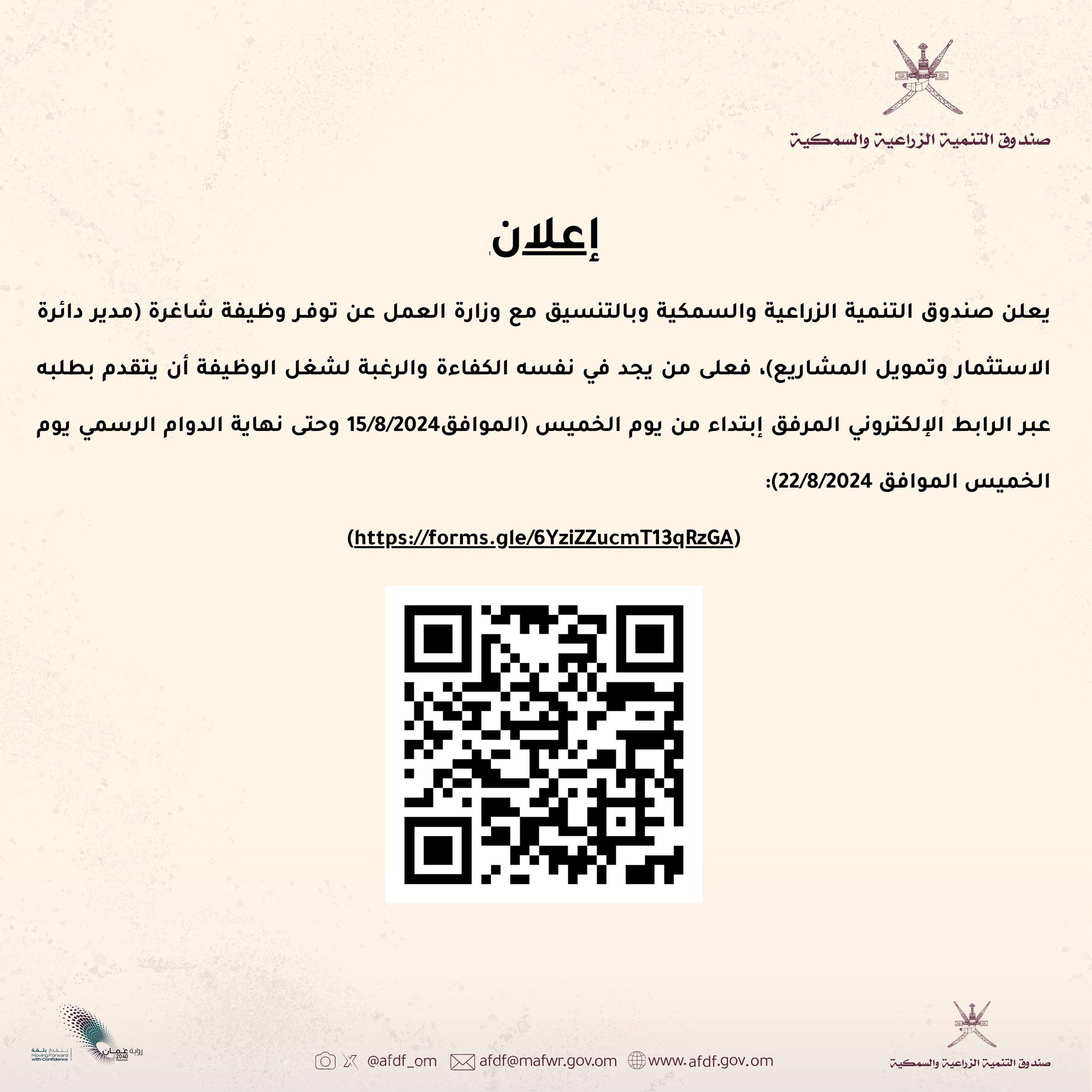 صندوق التنمية الزراعية والسمكية - وظيفة شاغرة ( مدير دائرة الاستثمار وتمويل المشاريع )