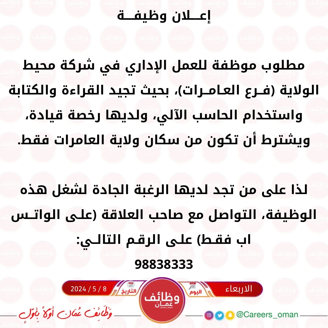 محيط الولاية فرع العامرات - وظيفة شاغرة ( موظفة )