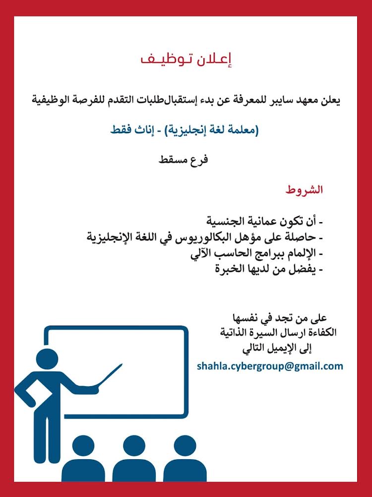 معهد سايبر للمعرفة - وظيفة شاغرة ( معلمة لغة إنجليزية )