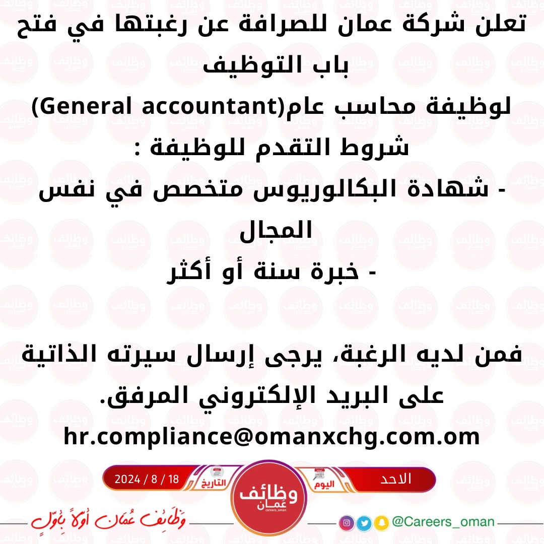 شركة عمان للصرافة - وظيفة شاغرة ( محاسب عام )