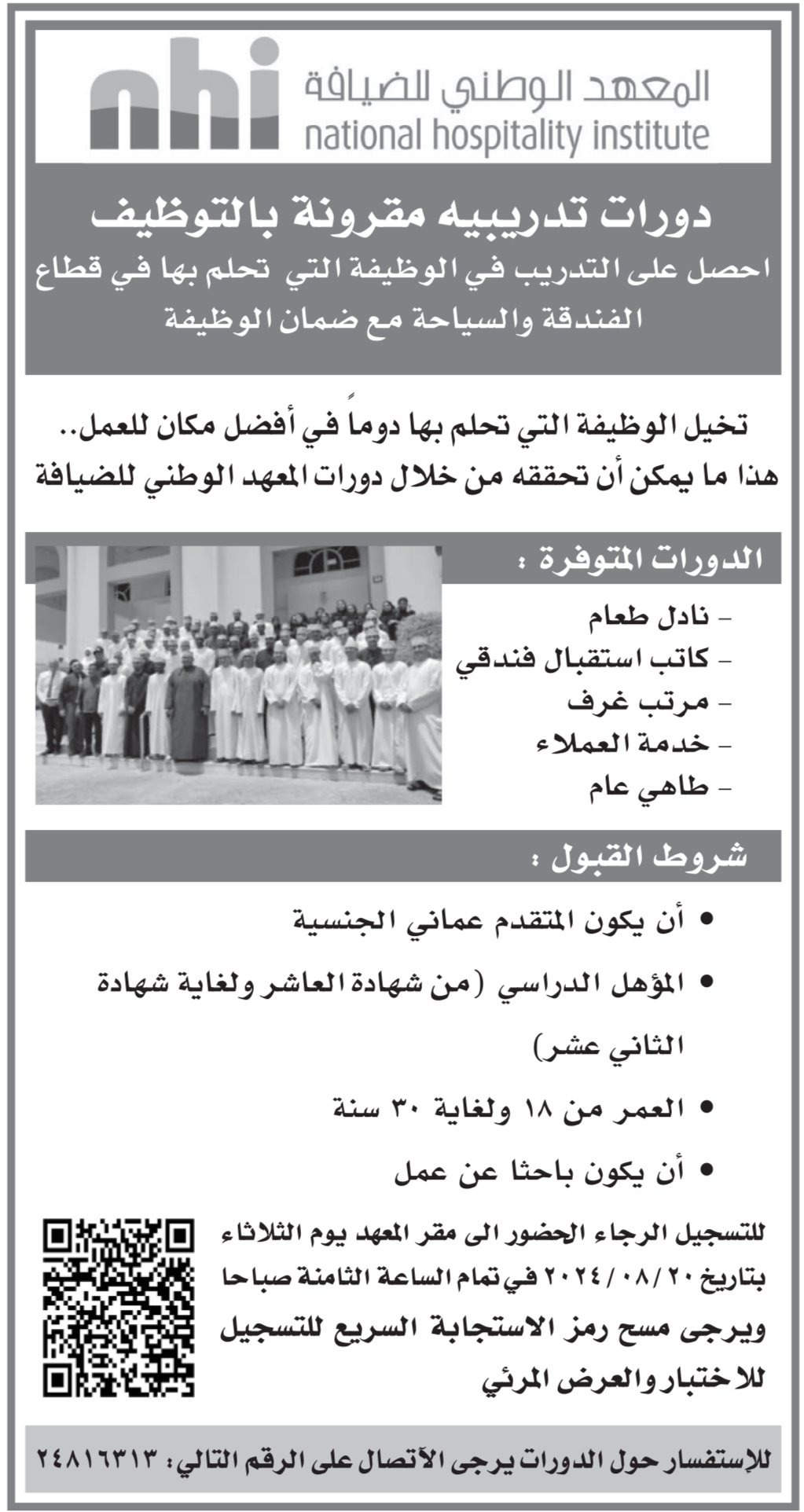 المعهد الوطني للضيافة - دورات تدريبيه مقرونة بالتوظيف في قطاع الفندقة والسياحة