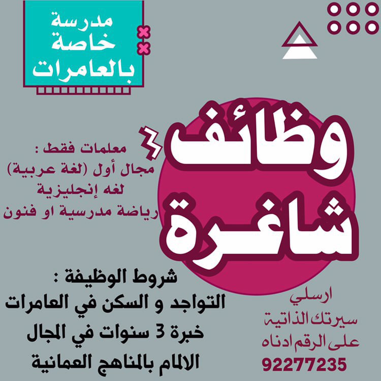 مدرسة خاصة في العامرات - وظائف شاغرة ( مجال أول لغة عربية / لغة إنجليزية + رياضة مدرسية او فنون )