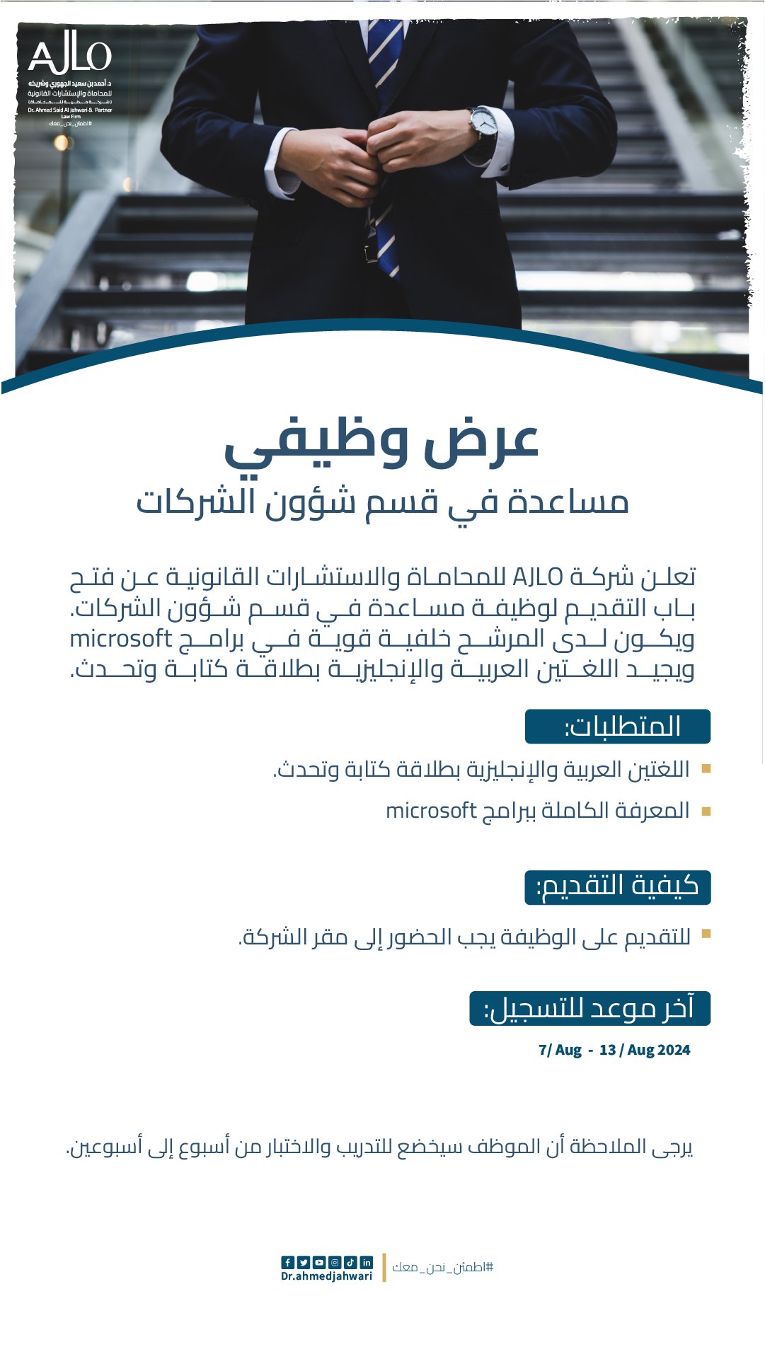 شركة AJLO للمحاماة والاستشارات القانونية - وظيفة شاغرة ( مساعدة في قسم شؤون الشركات )