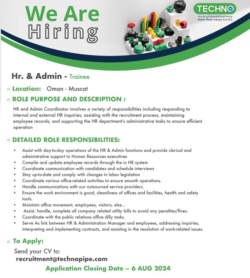 شركة صناعة تقنية البلاستيك - فرصة شاغرة ( HR & Admin - Trainee )