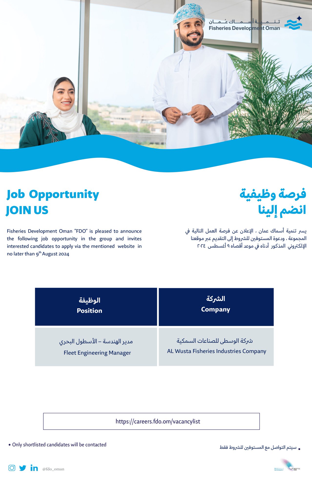 مجموعة تنمية أسماك عمان - وظيفة شاغرة ( مدير الهندسة - الأسطول البحري )