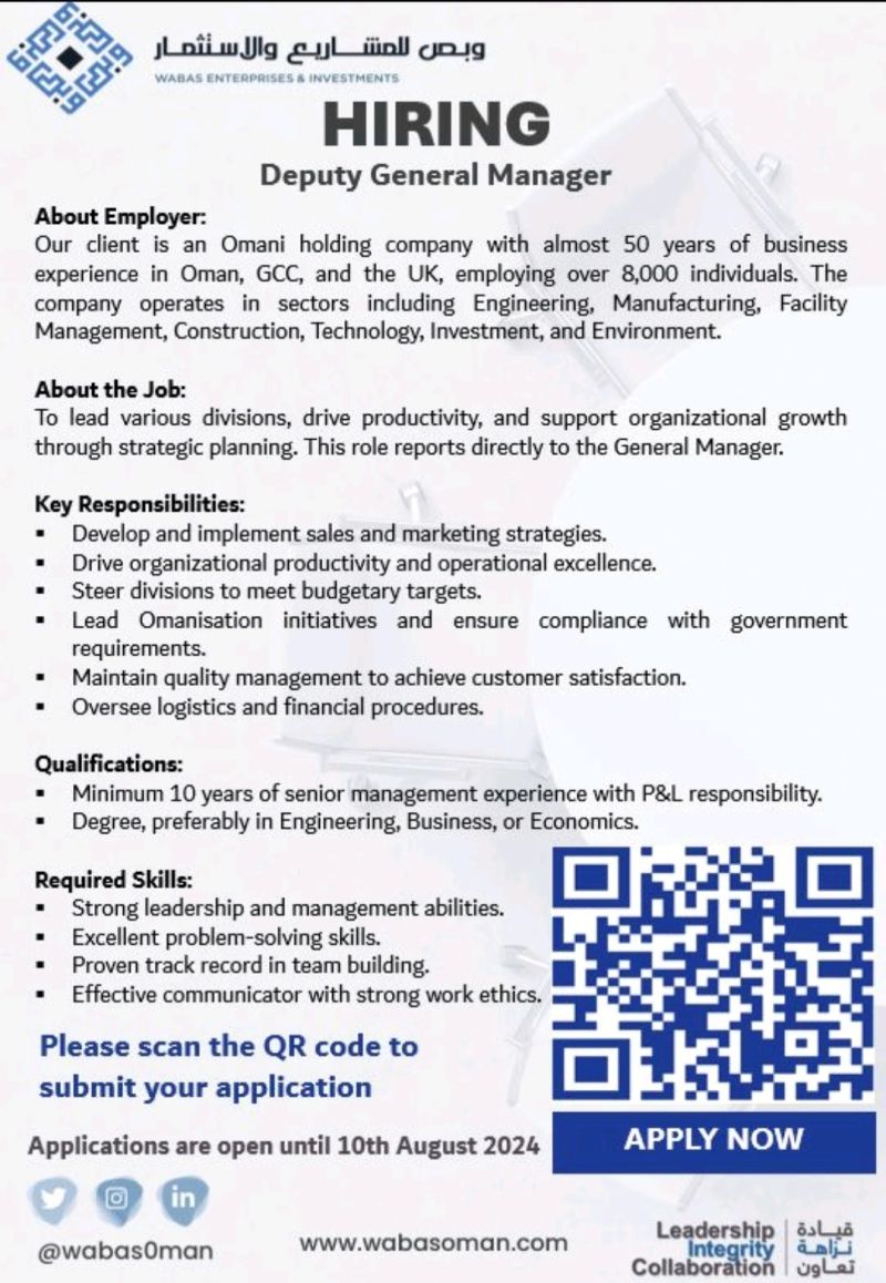 شركة وبص للمشاريع والاستثمار - وظيفة شاغرة ( Deputy General Manager )
