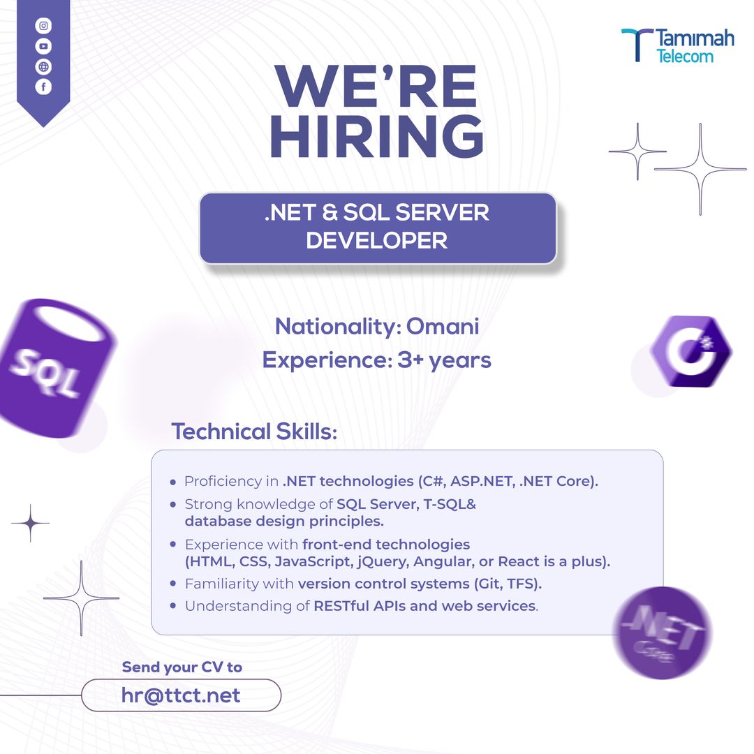 شركة تميمة للاتصالات - وظيفة شاغرة ( .NET & SQL SERVER DEVELOPER )