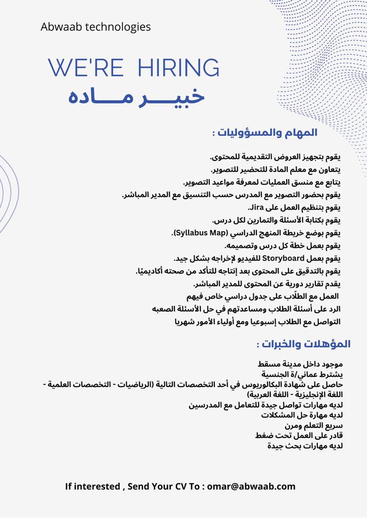 شركة أبواب للتكنولوجيا - وظيفة شاغرة ( خبير مادة )
