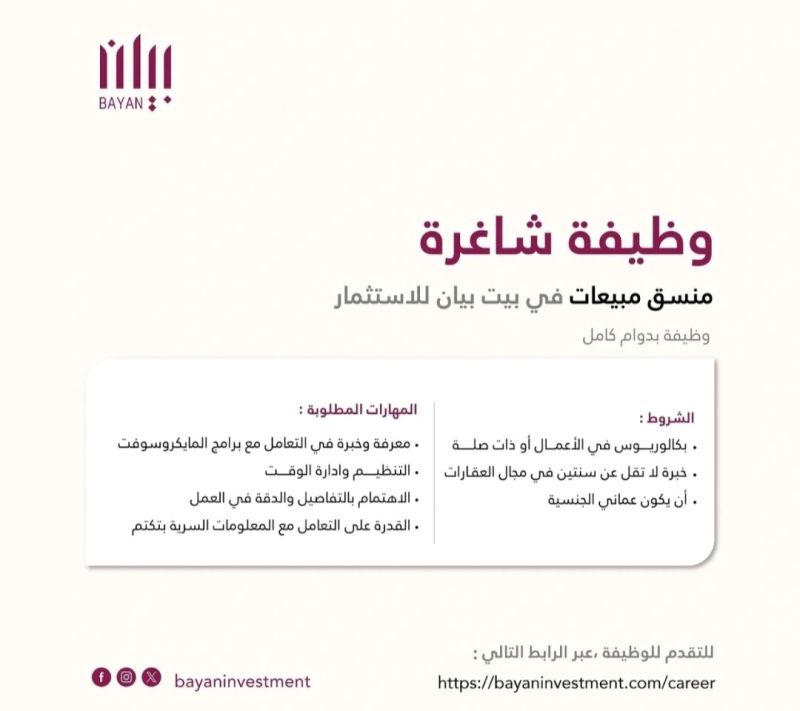 بيت بيان للاستثمار - وظيفة شاغرة ( منسق مبيعات )