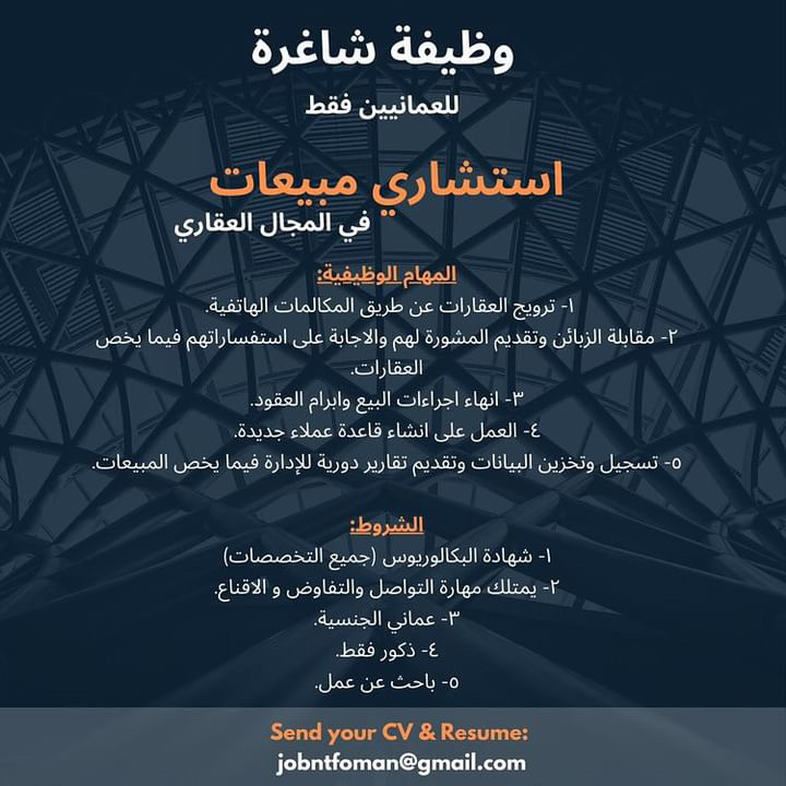 شركة رائدة في مجال العقارات في مسقط - فرص وظيفية ( استشاري مبيعات - PROPERTY CONSULTANT )