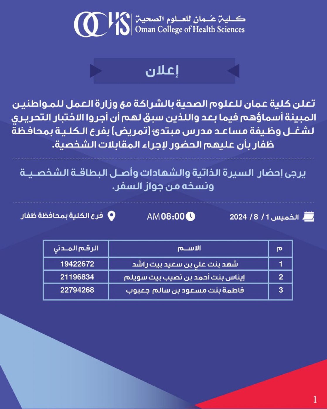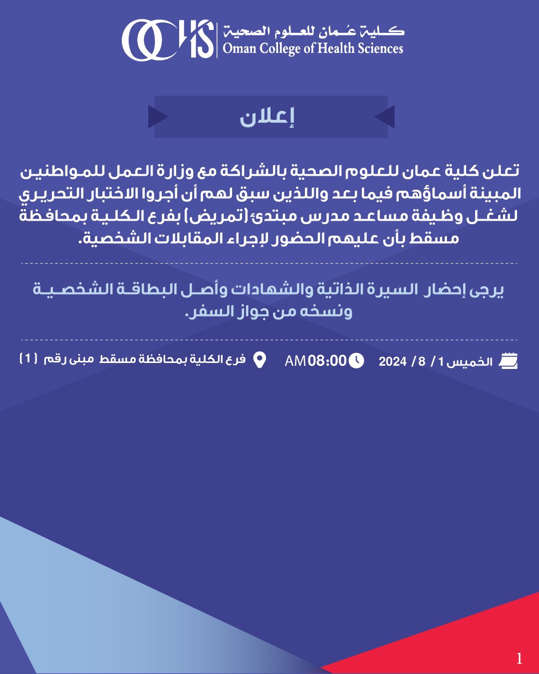 كلية عمان للعلوم الصحية - أسماء مواطنات لإجراء المقابلات الشخصية لشغل وظيفة مساعد مدرس مبتدئ ( تمريض) بفرع الكلية بمحافظة مسقط