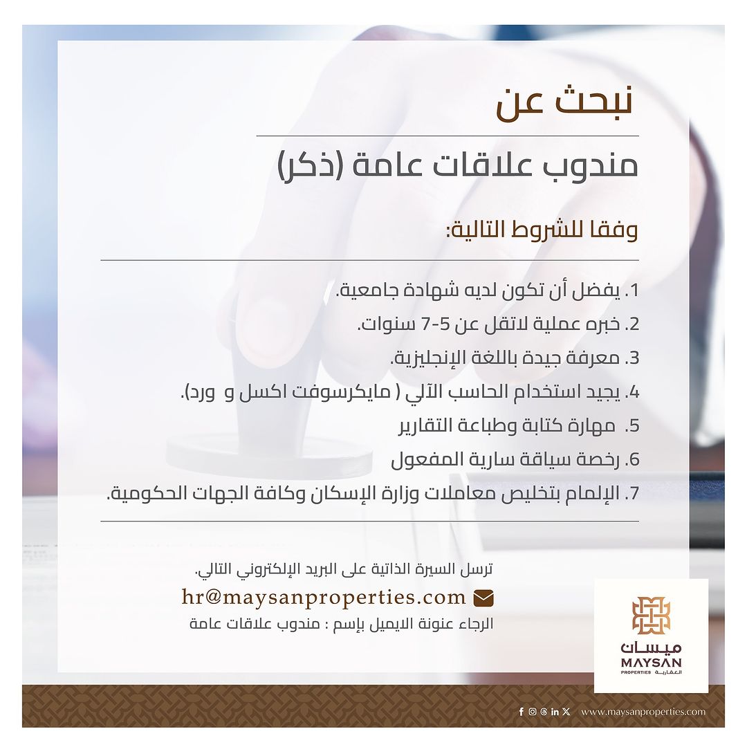 شركة ميسان العقارية - فرص وظيفية ( LEASING EXECUTIVE + مندوب علاقات عامة )