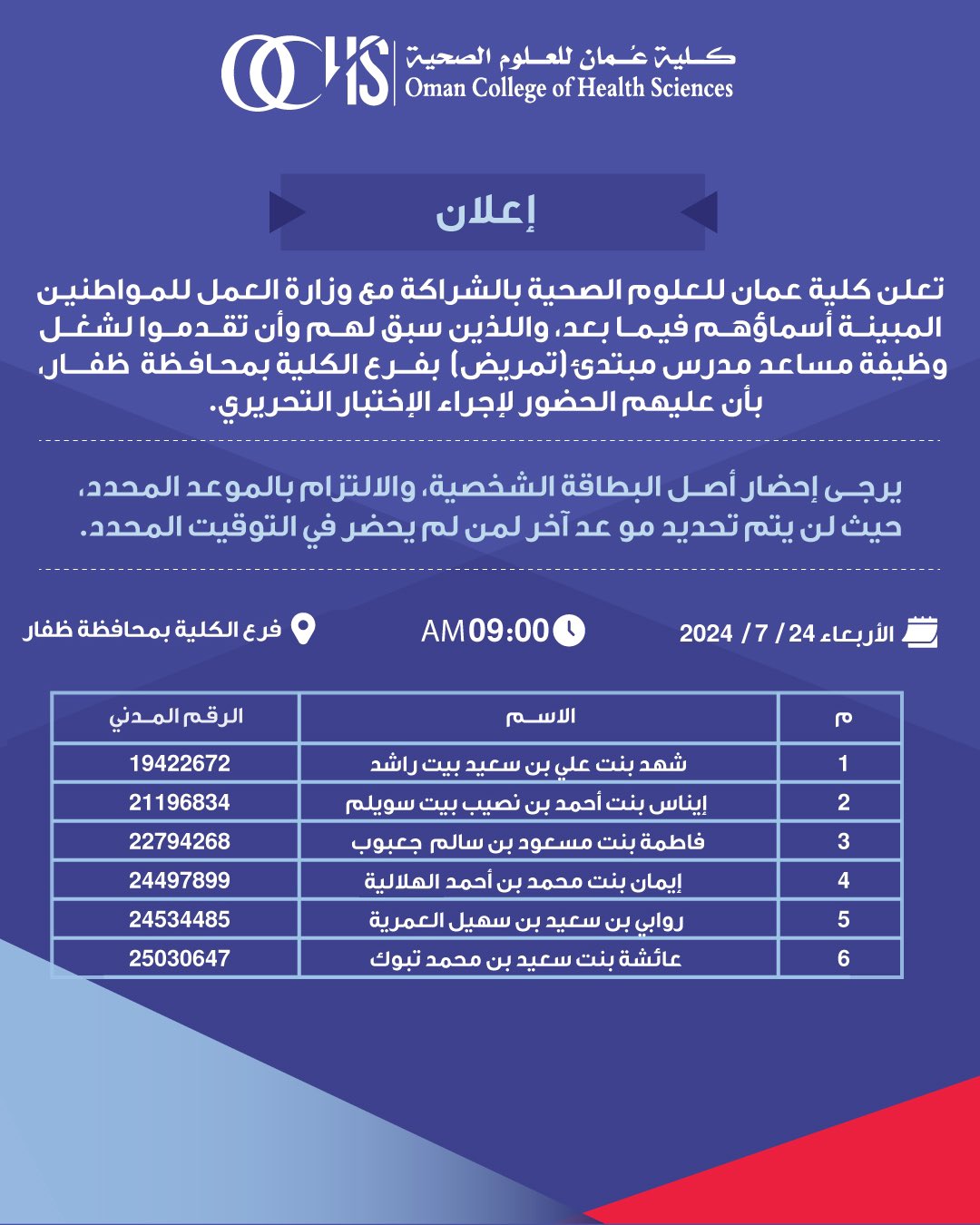 كلية عمان للعلوم الصحية - أسماء مواطنات لإجراء الإختبار التحريري لشغل وظيفة مساعد مدرس مبتدئ ( تمريض) بفرع الكلية بمحافظة ظفار