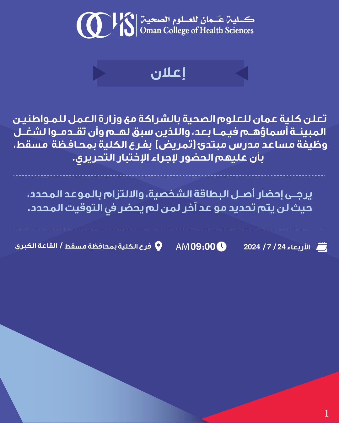 كلية عمان للعلوم الصحية - أسماء مواطنين لإجراء الإختبار التحريري لشغل وظيفة مساعد مدرس مبتدئ ( تمريض) بفرع الكلية بمحافظة مسقط