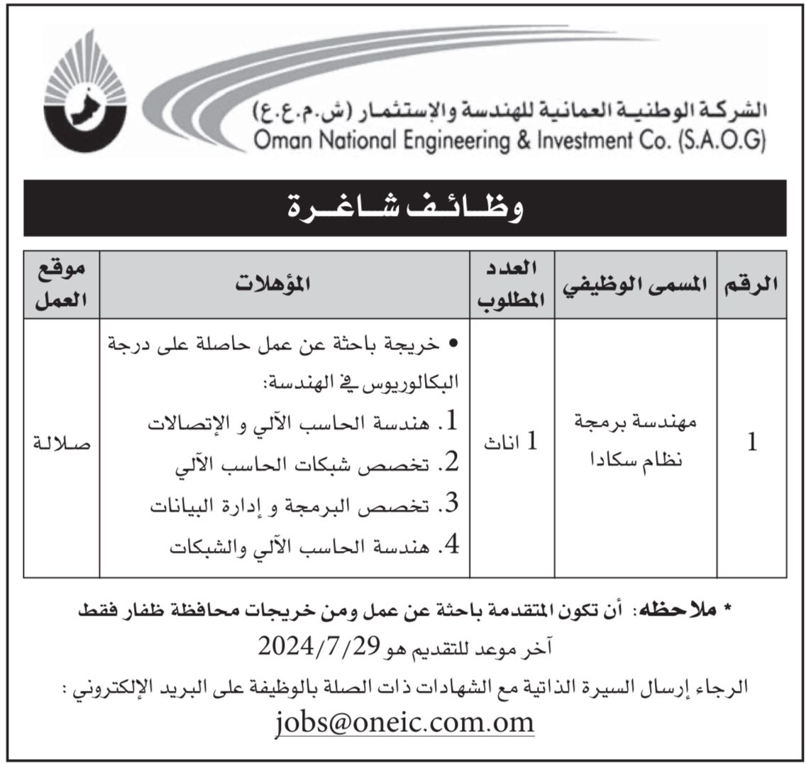 الشركة الوطنية العمانية للهندسة والاستثمار في صلالة - وظيفة شاغرة ( مهندسة برمجية نظام سكادا )