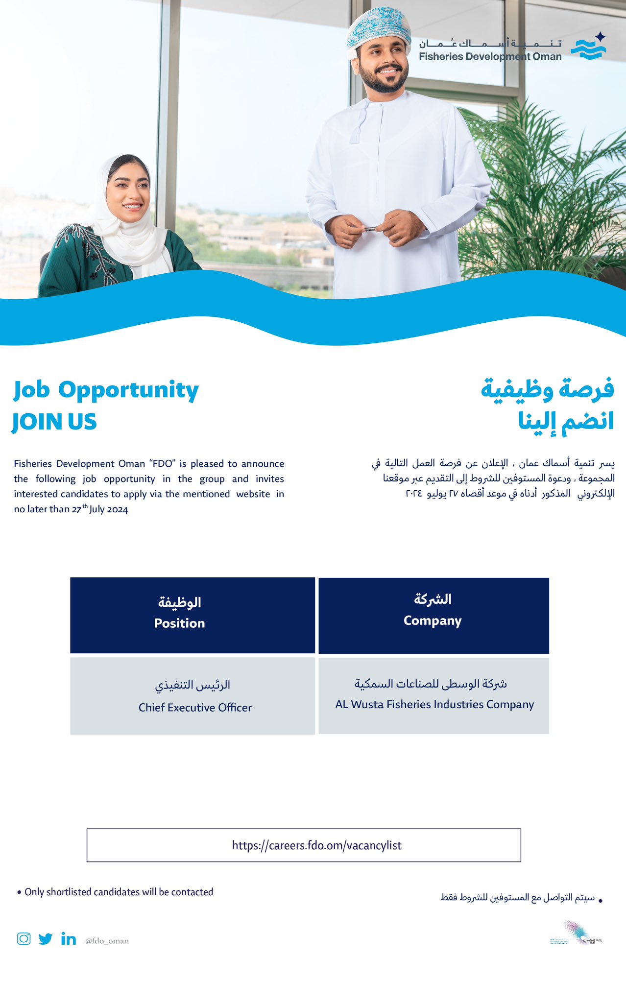 تنمية أسماك عمان - وظيفة شاغرة ( الرئيس التنفيذي )
