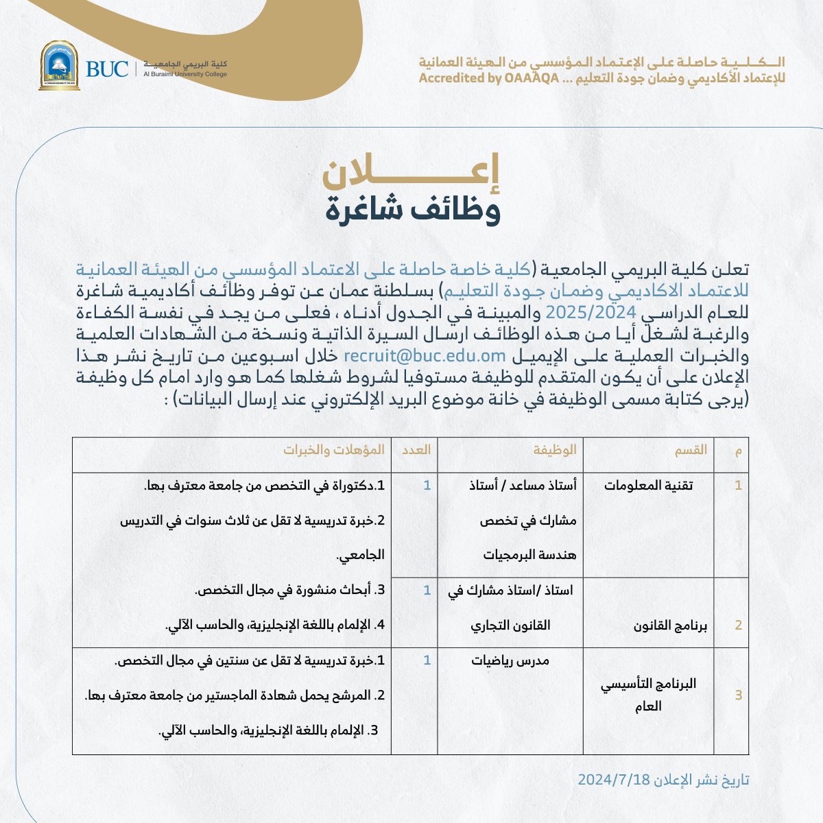 كلية البريمي الجامعية - وظائف شاغرة