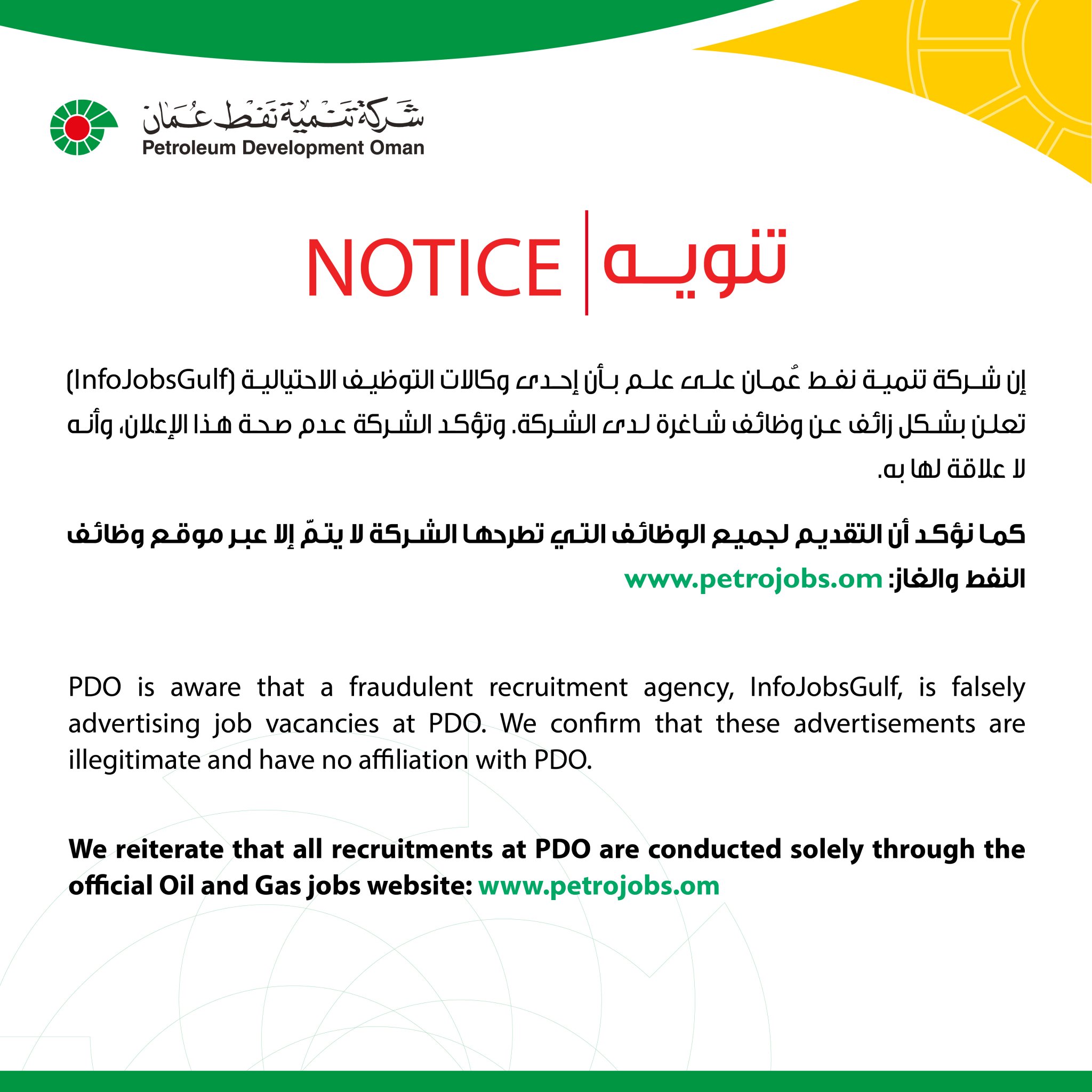 شركة تنمية نفط عمان - تنويه بشأن وكالة التوظيف الاحتيالية InfoJobsGulf