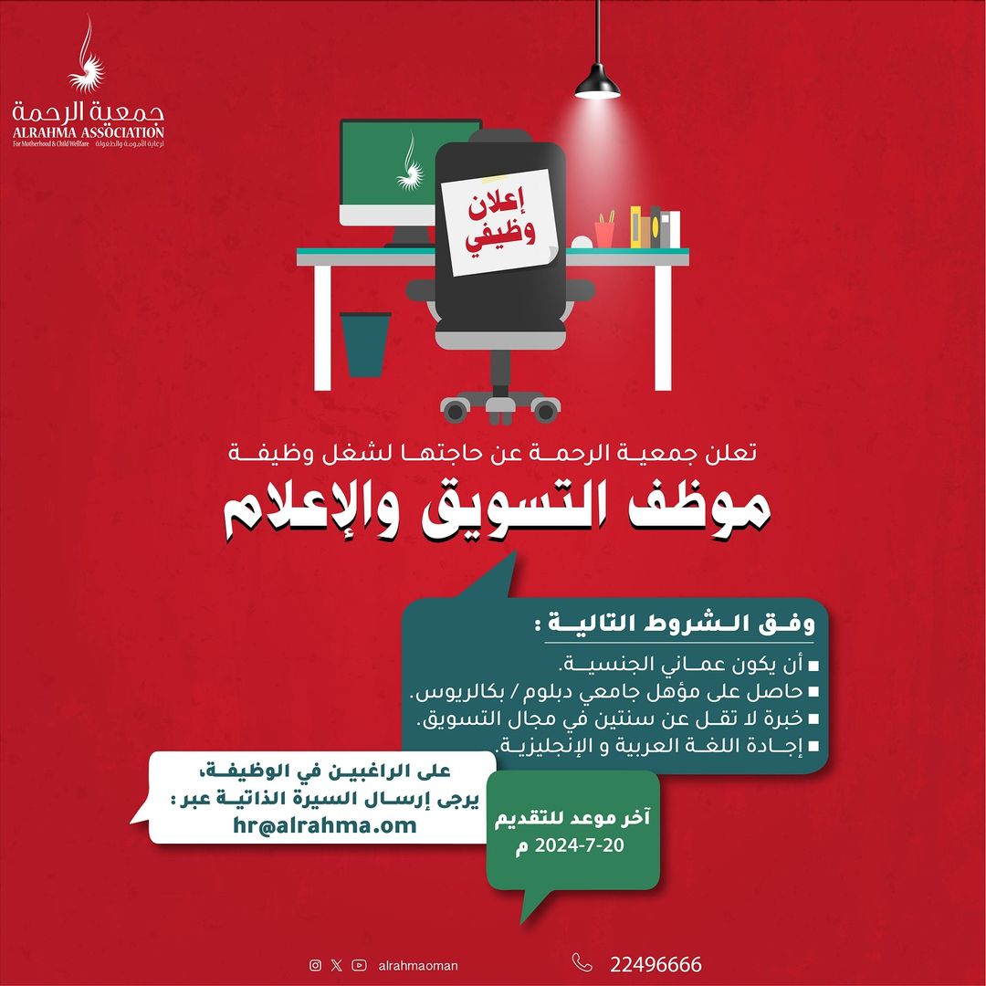 جمعية الرحمة - فرص وظيفية جديدة ( تسويق واعلام - مسؤول النشاط التطوعي - اخصائي اجتماعي )