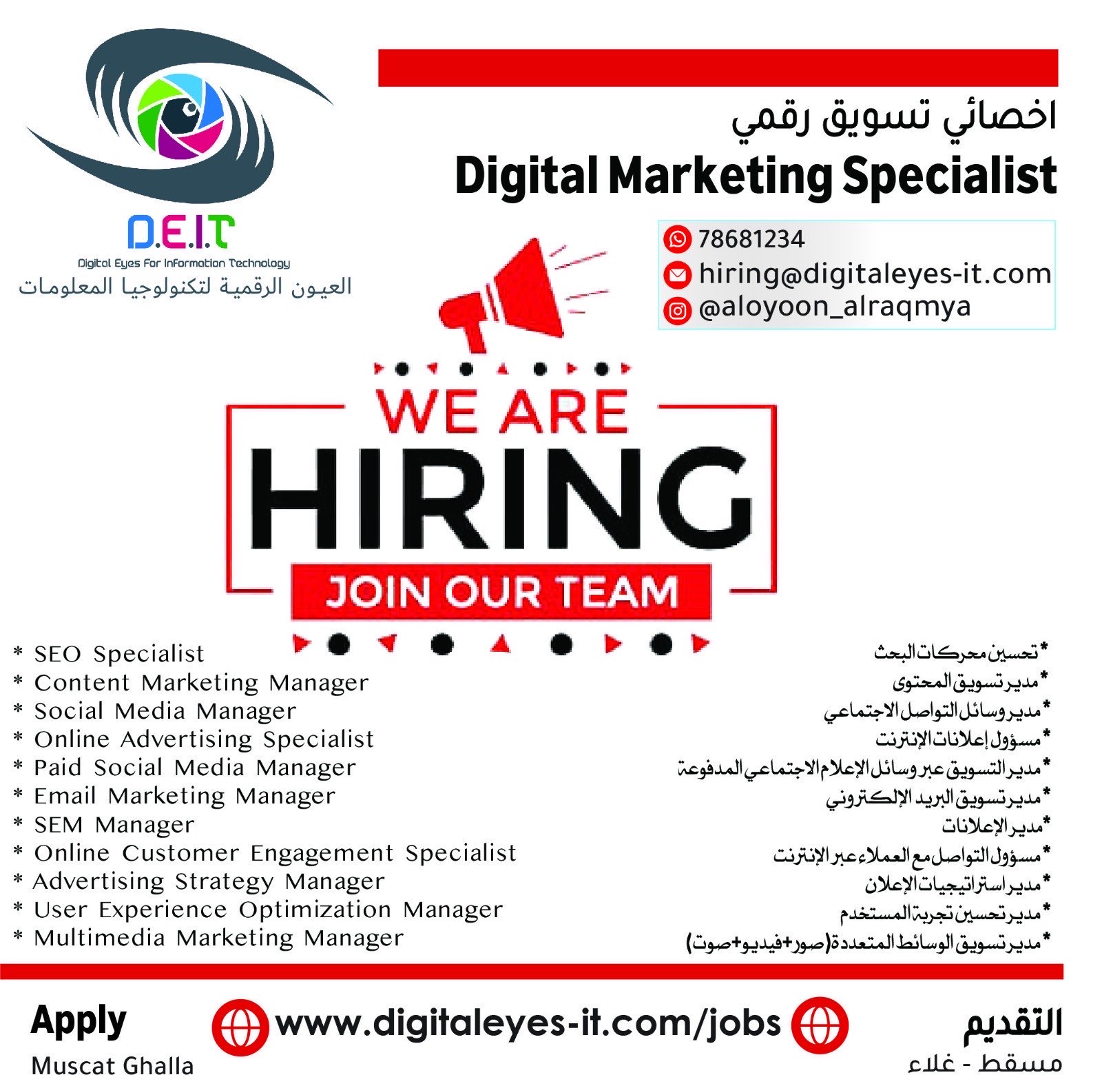 العيون الرقمية لتكنولوجيا المعلومات في مسقط - فرص وظيفية جديدة ( اخصائي تسويق رقمي - مصمم جرافيكس - مسؤول بيع هاتفي )