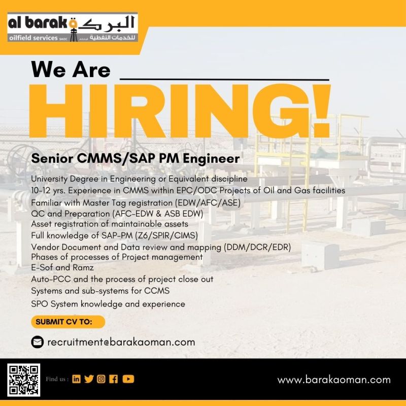 البركة للخدمات النفطية - فرصة وظيفية ( Senior CMMS/SAP PM Engineer )