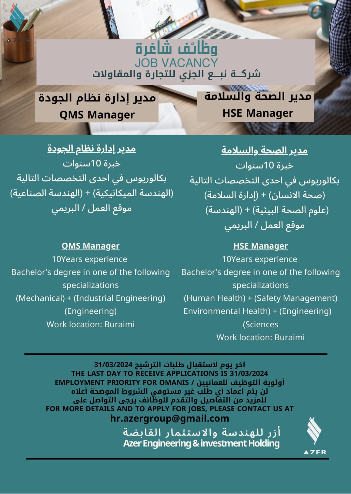 شركة نبع الجزي للتجارة والمقاولات - فرص وظيفية ( مدير صحة والسلامة - مدير إدارة نظام الجودة )