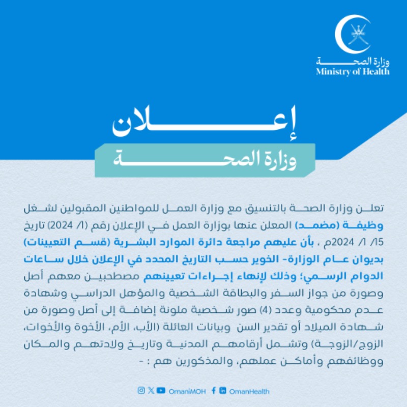 وزارة الصحة - أسماء مواطنين لإنهاء إجراءات تعيينهم لشغل وظيفة (مضمد)