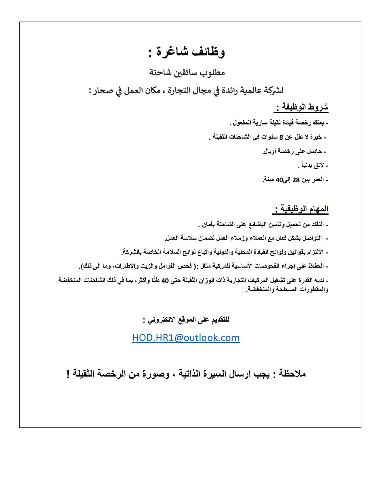 شركة عالمية رائدة في مجال التجارة في صحار - وظيفة شاغرة ( سائقين شاحنة )