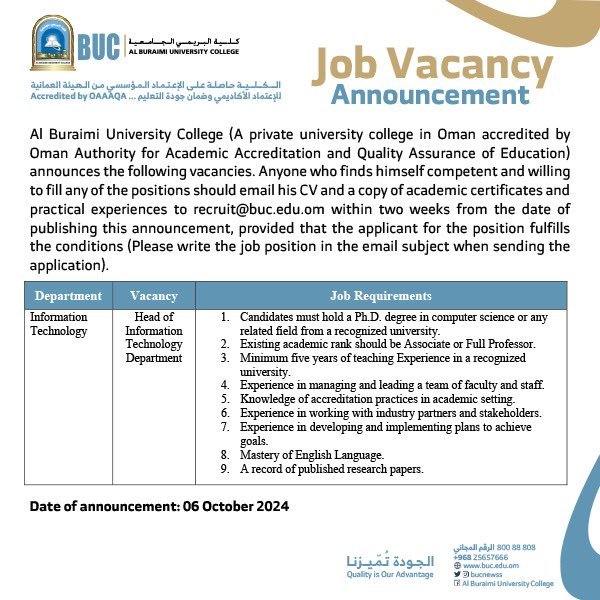 كلية البريمي الجامعية - وظيفة شاغرة ( رئيس قسم تكنولوجيا المعلومات )