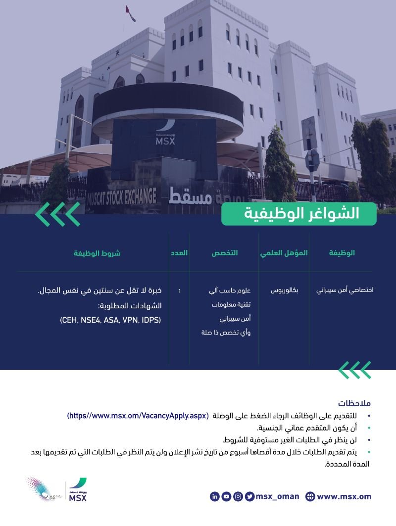 بورصة مسقط - فرصة وظيفية ( اختصاصي أمن سيبراني )