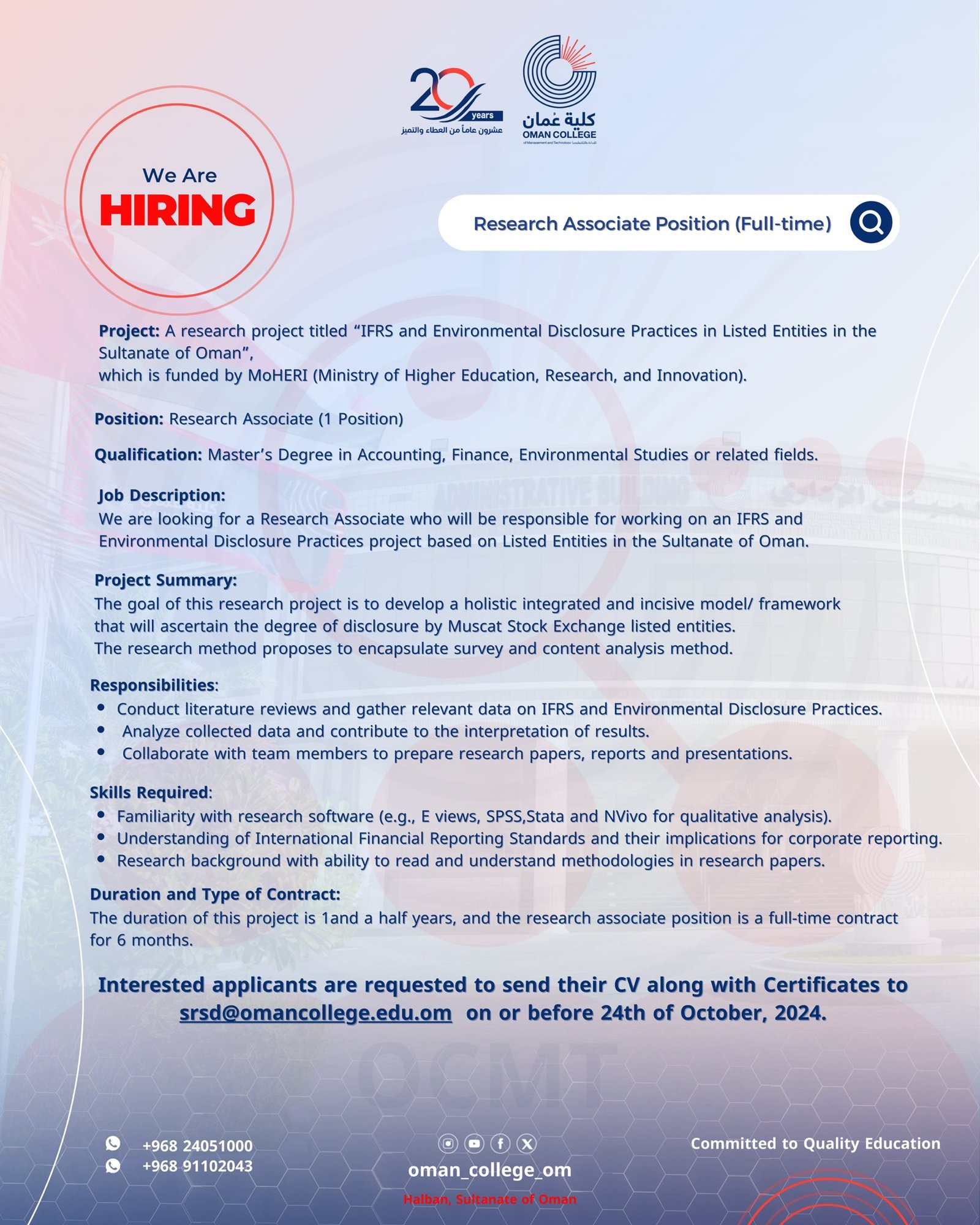 كلية عمان للإدارة والتكنولوجيا - وظيفة شاغرة ( Research Associate Position )