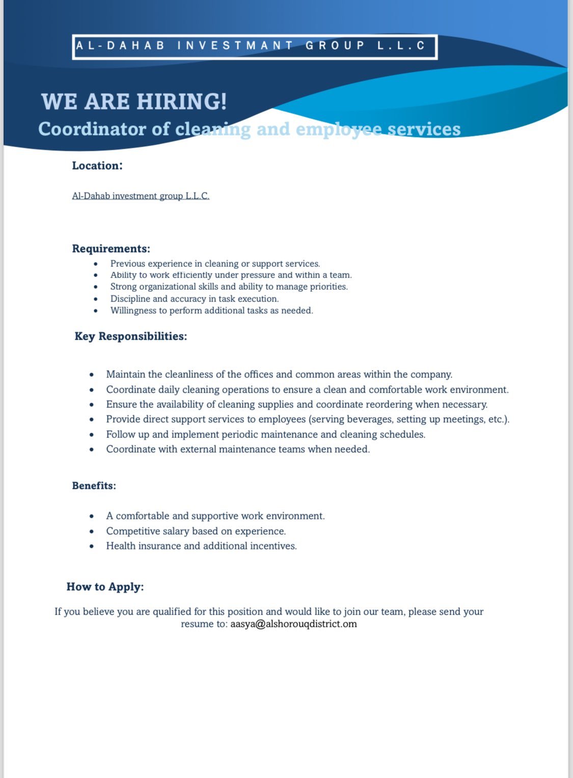 مجموعة الذهب للاستثمارات - وظيفة شاغرة ( Coordinator of cleaning and employee services )