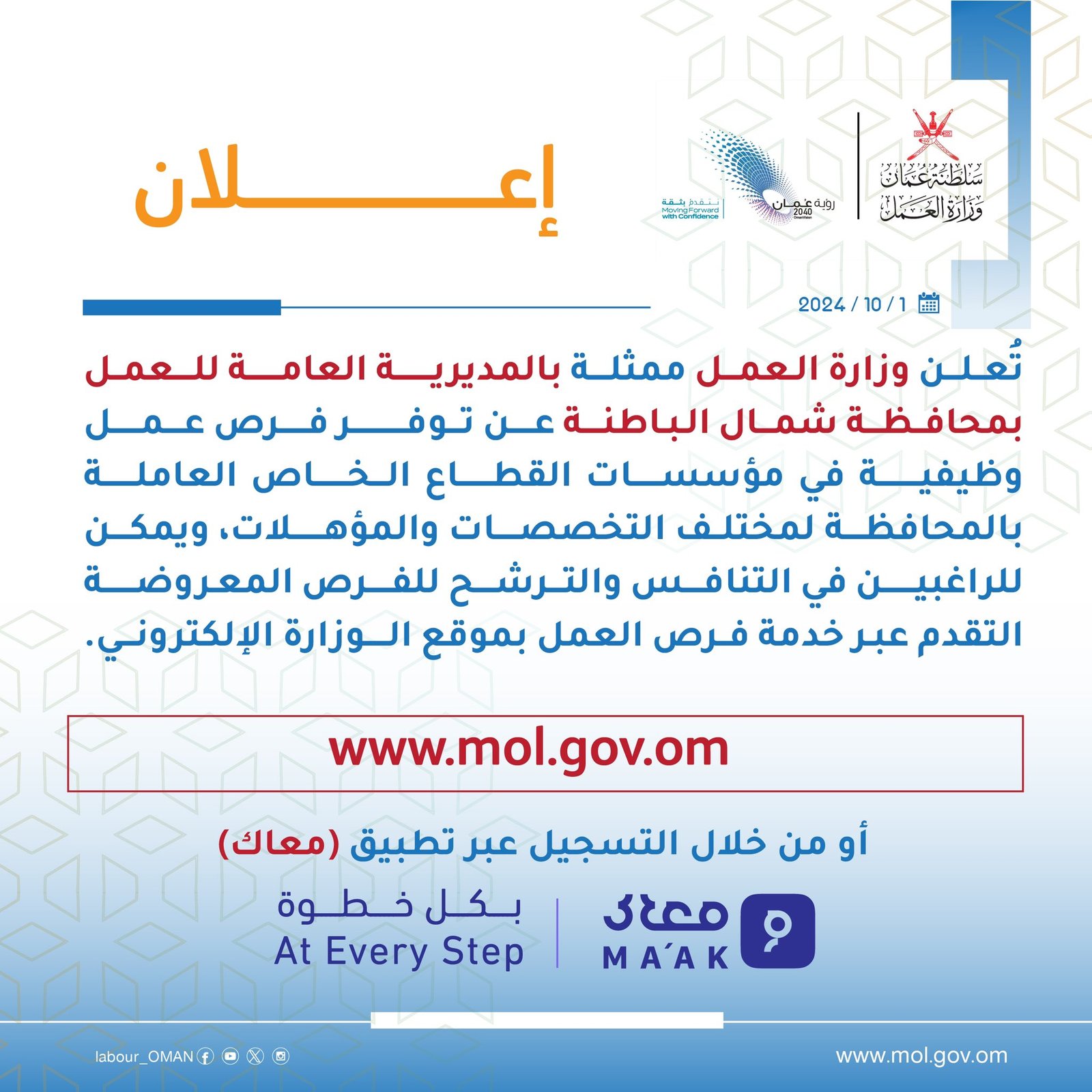 وزارة العمل ممثلة بالمديرية العامة للعمل بمحافظة شمال الباطنة - توفر فرص عمل وظيفية في مؤسسات القطاع الخاص