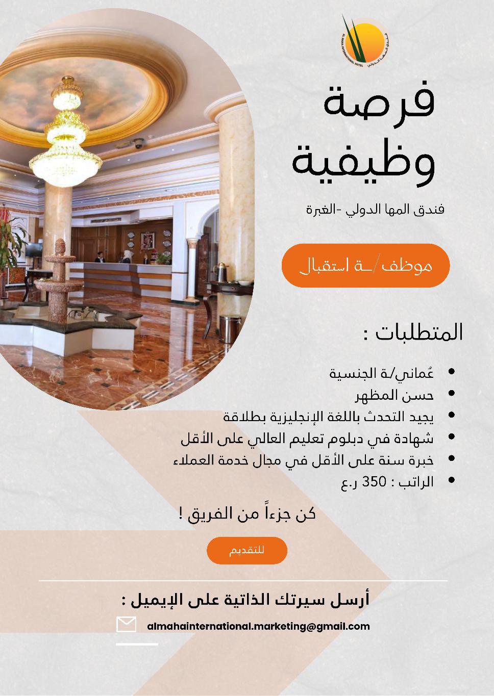 فندق المها الدولي في الغبرة - وظيفة شاغرة ( موظف/ة استقبال )