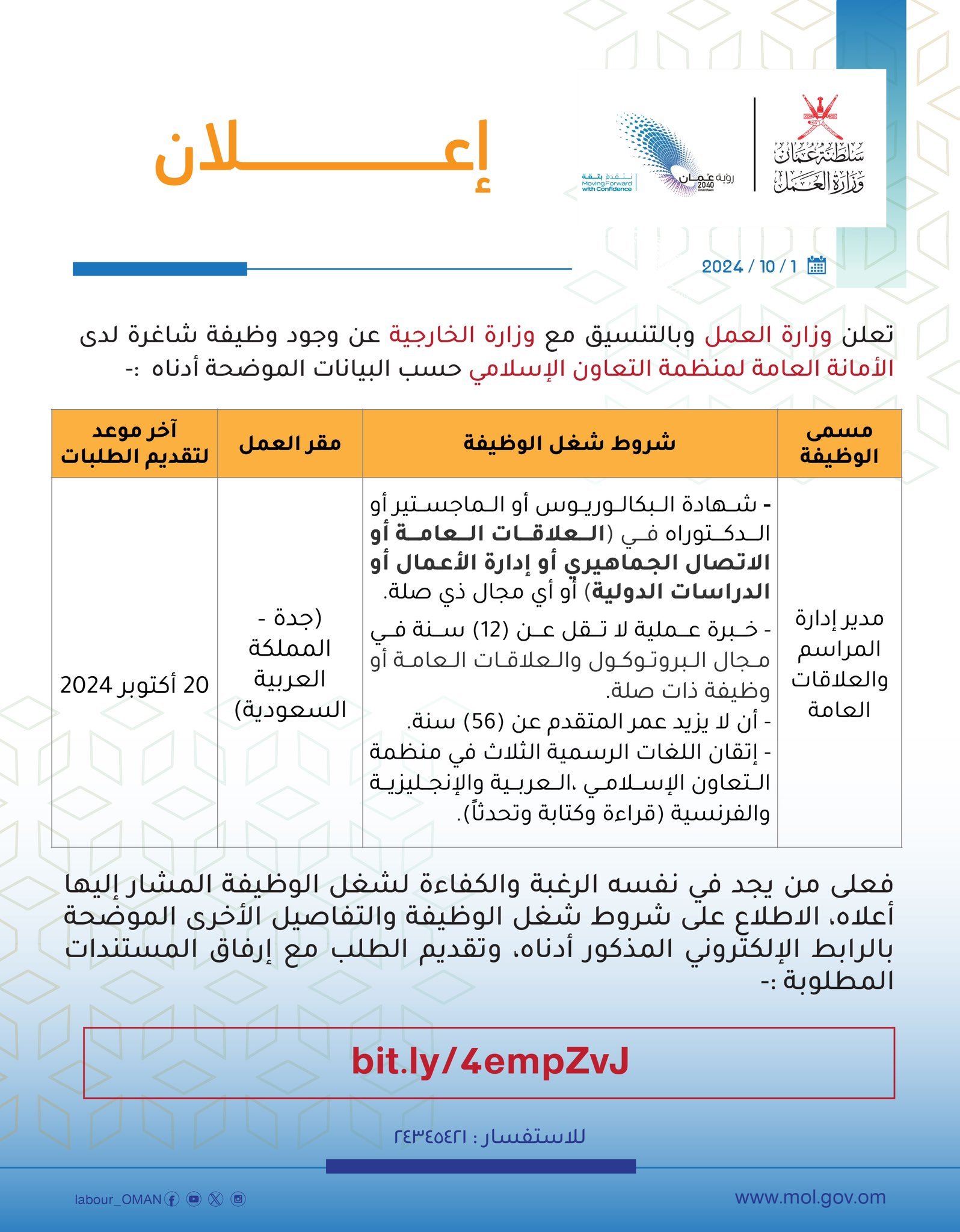 وزارة العمل بالتنسيق مع وزارة الخارجية - توفر وظيفة شاغرة لدى الأمانة العامة لمنظمة التعاون الإسلامي
