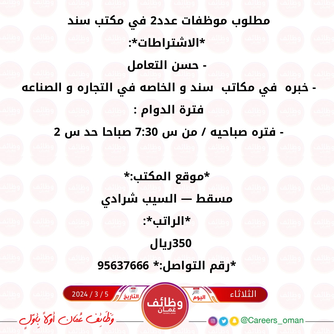 مكتب سند للخدمات في السيب - فرصة وظيفية ( موظفات / العدد 2 )