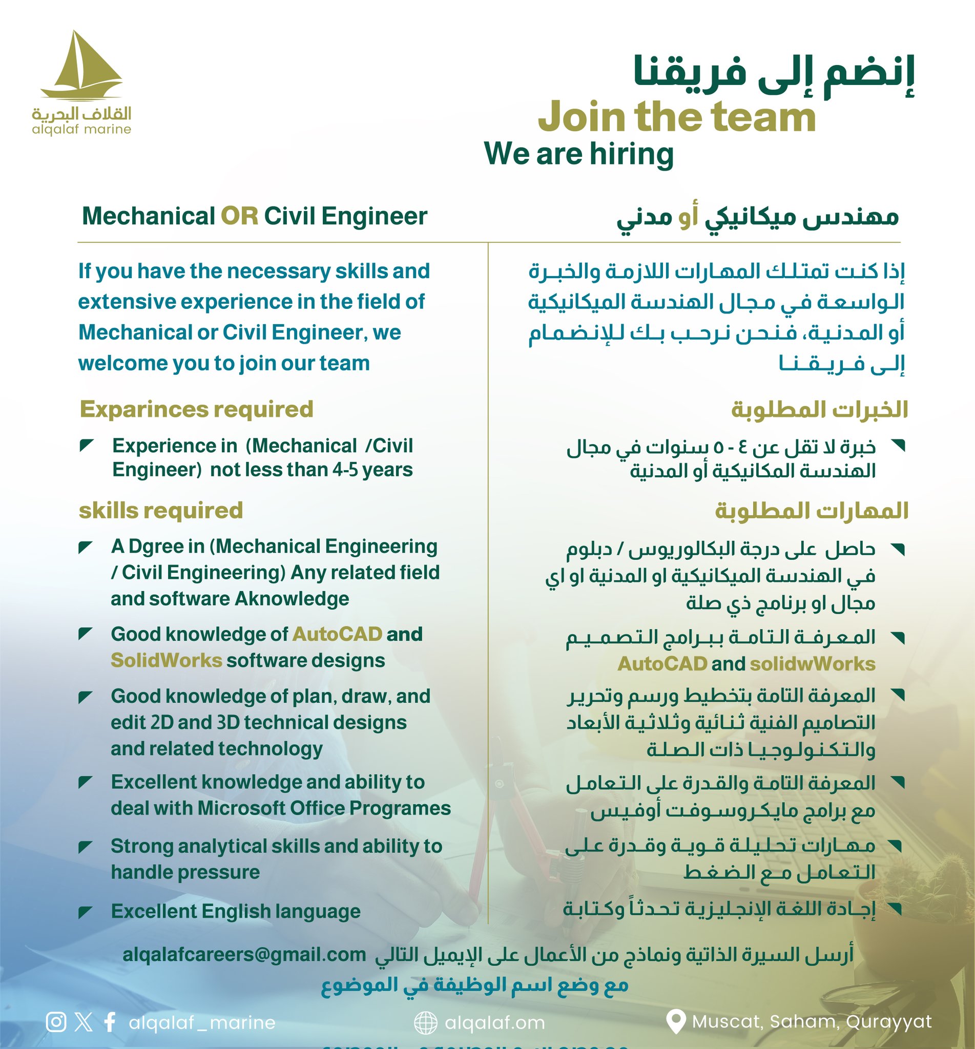 شركة القلاف البحرية - فرص وظيفية شاغرة ( مهندس ميكانيكي أو مدني + محاسب )