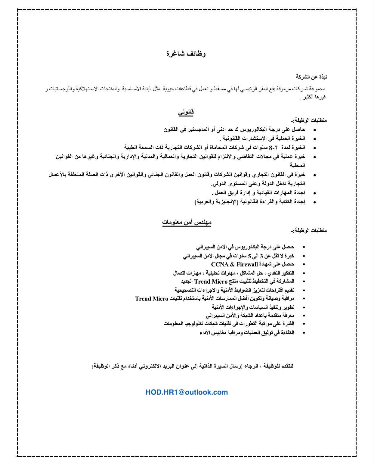 مجموعة شركات مرموقة في مسقط - فرص وظيفية ( قانوني + مهندس أمن معلومات )