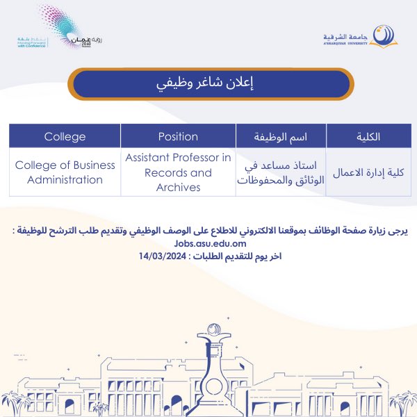 جامعة الشرقية - وظيفة شاغرة ( أستاذ مساعد في الوثائق والمحفوظات )