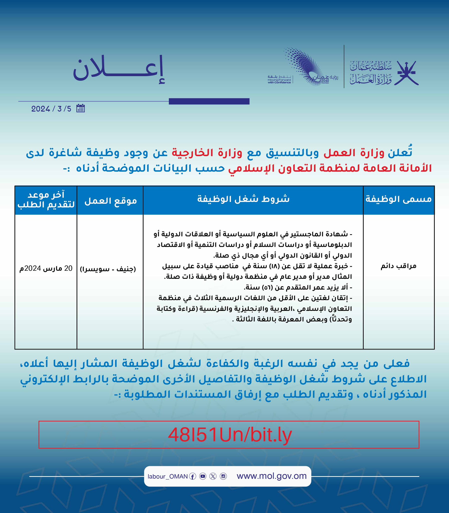 وزارة العمل وبالتنسيق مع وزارة الخارجية عن وجود وظيفة شاغرة لدى الأمانة العامة لمنظمة التعاون الإسلامي