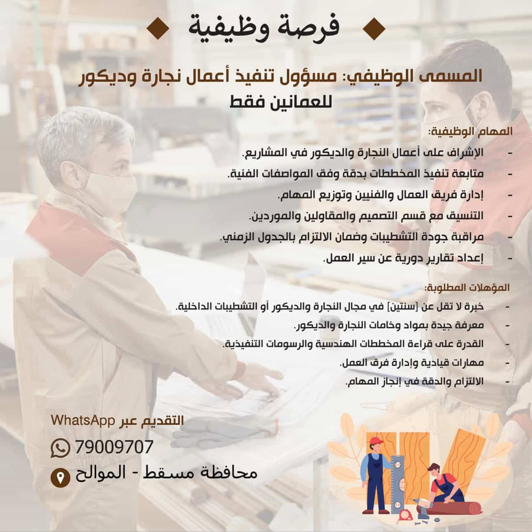 شركة جوف للأثاث والديكور في الموالح - وظيفة شاغرة ( مسؤول تنفيذ أعمال نجارة وديكور )