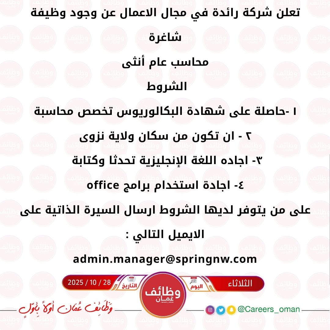 شركة رائدة في مجال الأعمال في نزوى - وظيفة شاغرة ( محاسب عام أنثى )