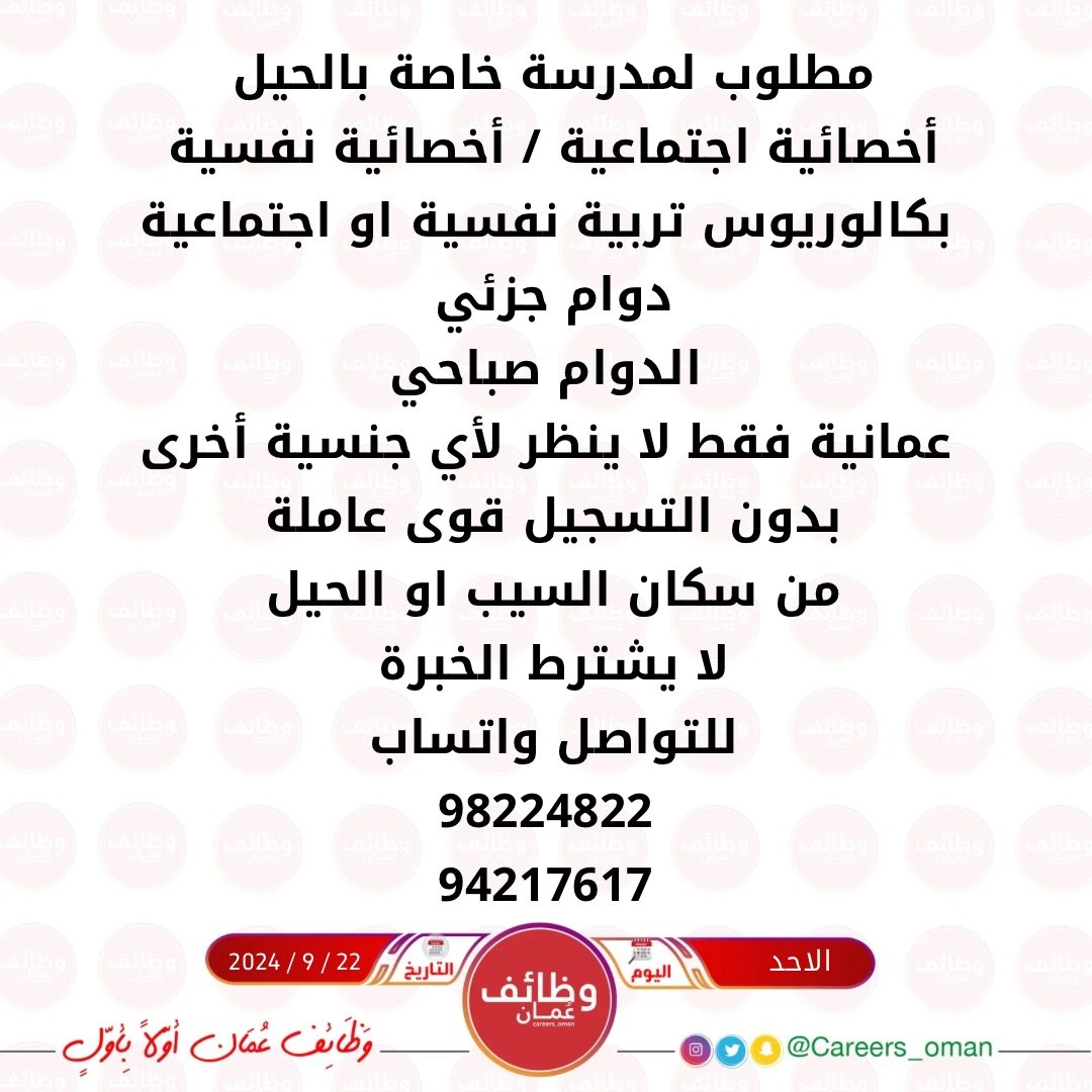 مدرسة خاصة في الحيل - فرصة وظيفية ( أخصائية أجتماعية او أخصائية نفسية )