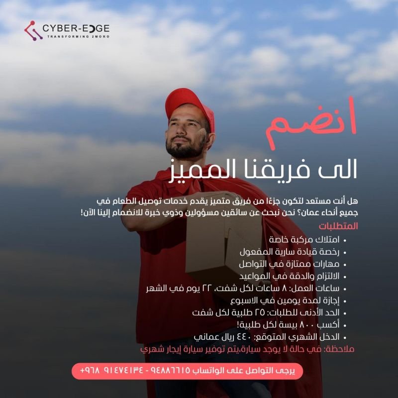 شركة Cyber Edge - فرص وظيفية ( سائقين خدمات توصيل الطعام في كل أنحاء عمان )