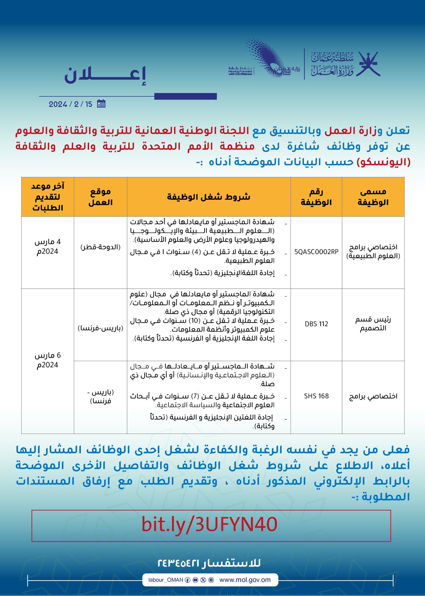 وزارة العمل بالتنسيق مع اللجنة الوطنية العمانية للتربية والثقافة والعلوم - وظائف شاغرة لدى منظمة(اليونسكو)