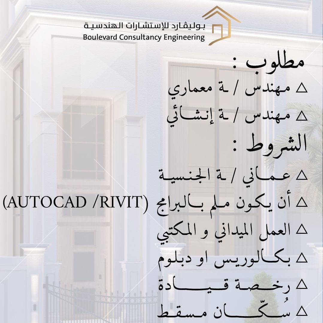 شركة بوليفارد للاستشارات الهندسية - فرص وظيفية ( مهندس/ـة معماري + مهندس/ـة إنشائي )