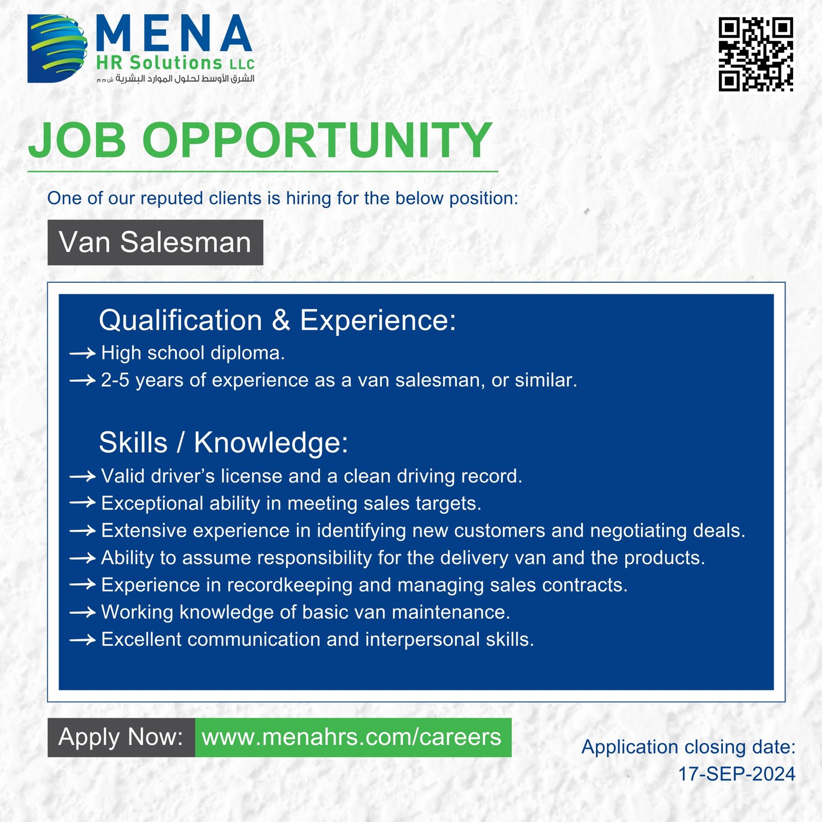 الشرق الأوسط لحلول الموارد البشرية - فرصة وظيفية ( Van Salesman )