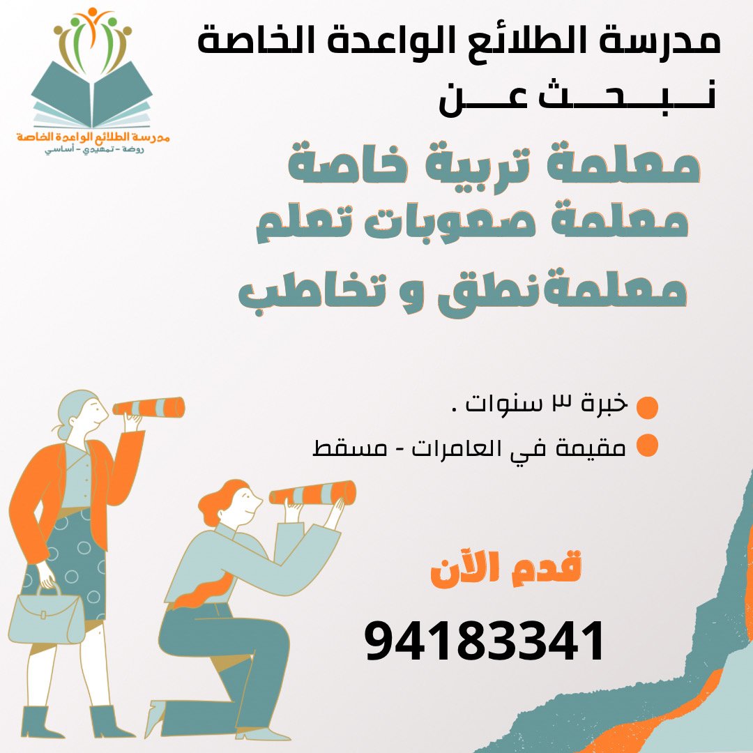 مدرسة الطلائع الواعدة الخاصة في العامرات - فرص وظيفية جديدة ( معلمة تربية خاصة + معلمة صعوبات تعلم + معلمة نطق وتخاطب )