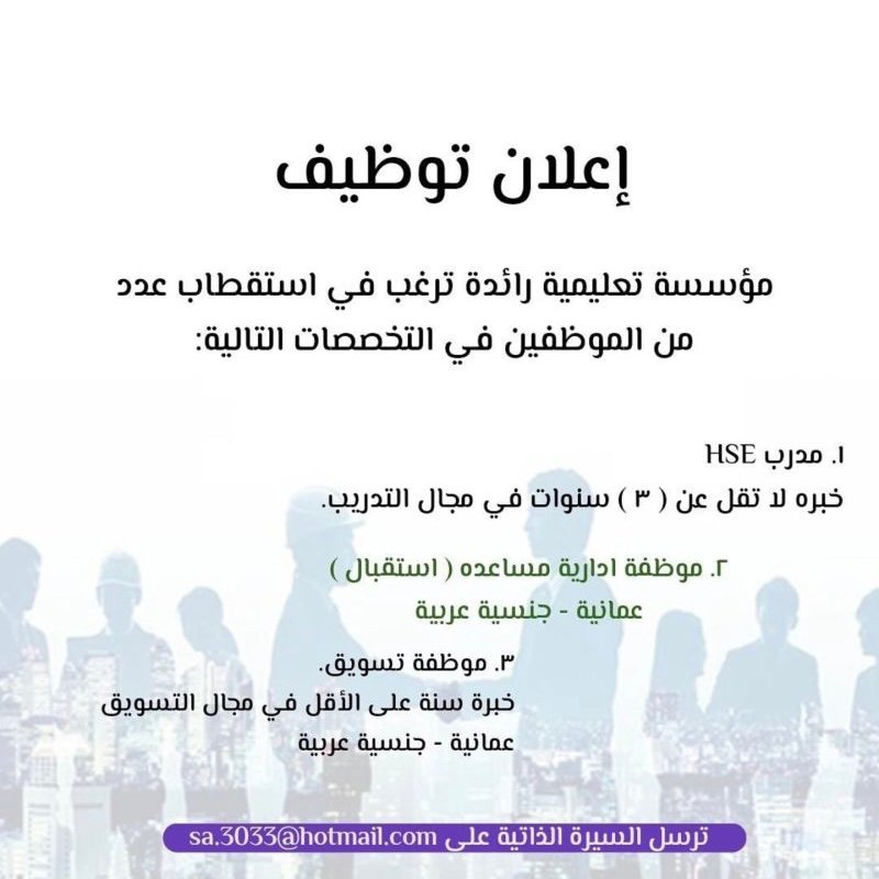 مؤسسة تعليمية رائدة - فرص وظيفية ( مدرب HSE - موظفة استقبال + موظفة تسويق )